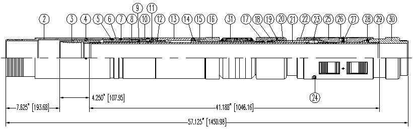 13. Screw Slip Housing to Nut (item 22) wrench tight. Rotate and align shear screw hole in Slip Housing with hole in Top Cone. Install Shear Screw (item 24).