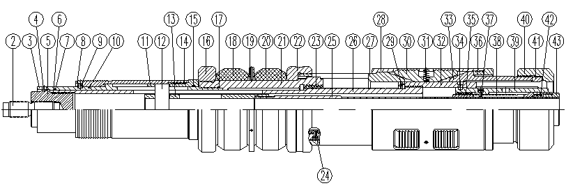 6.Slide Collet Body (item 29) over Collet Support (item 38).Install Shear Screw (item 5) . Screw Collet Body to upper Body (item 6). This forces all inside components to their proper position inside the Upper Body. Install Socket Set Screw(item 23). Align all slots and temporarily install Crosslink (item 32) to keep components in position.